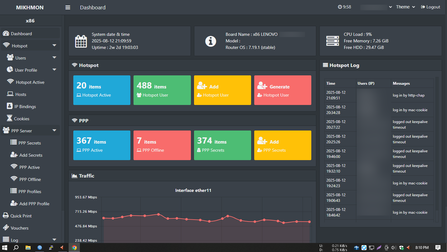 Server PPPoE, Hotspot captive portal Billing voucher sistem, Static, Dynamic. Seting iklan untuk media promosi komersil / Non- Komersil, saat login ke hotspot.